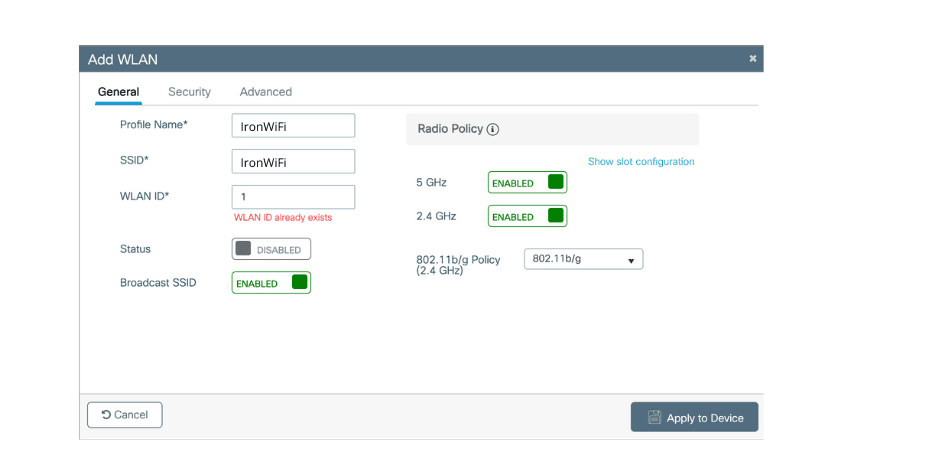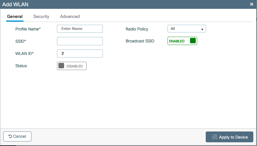 Появится диалоговое окно Add WLAN. Вкладка General выбрана.