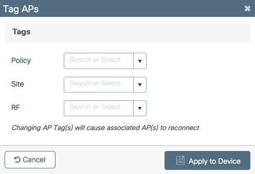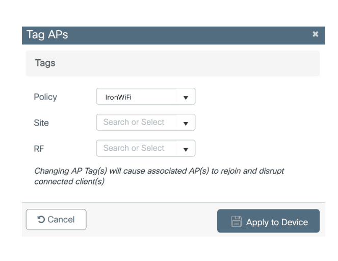 Чтобы развернуть настроенные политики на точках доступа, каждый Policy Tag должен быть прикреплен к необходимой точке доступа.