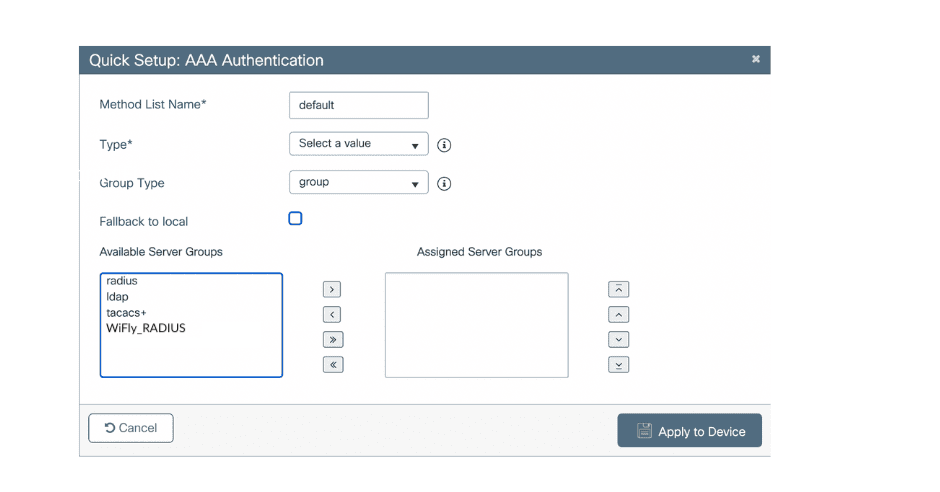 - Убедитесь, что выбраны RADIUS и Server Groups.