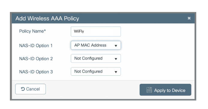 — как Policy Name выберите созданную ранее Wireless AAA Policy (например, «WiFly»)