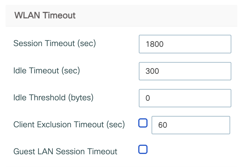 9. В разделе WLAN Timeout снимите флажок с опции Client Exclusion Timeout