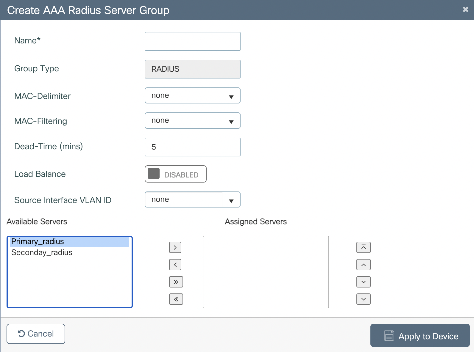 Появится диалоговое окно Create AAA Radius Server. - Введите Name, например, «Primary_radius».