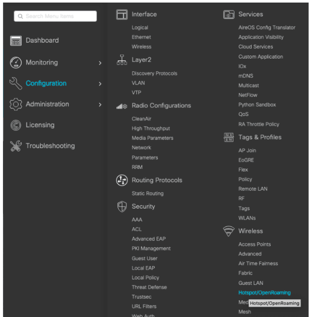 - Выберите Configuration > Wireless > Hotspot/OpenRoaming из меню слева в панели управления.