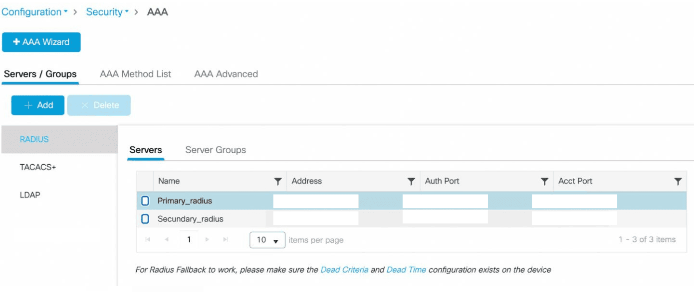 Появится страница AAA. - Убедитесь, что выбраны RADIUS и Servers.
