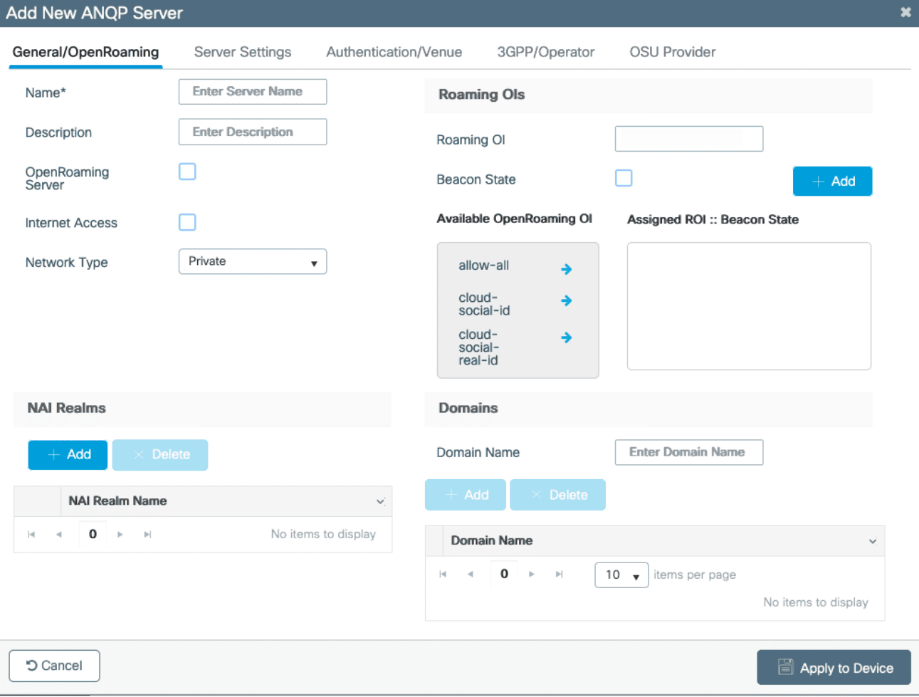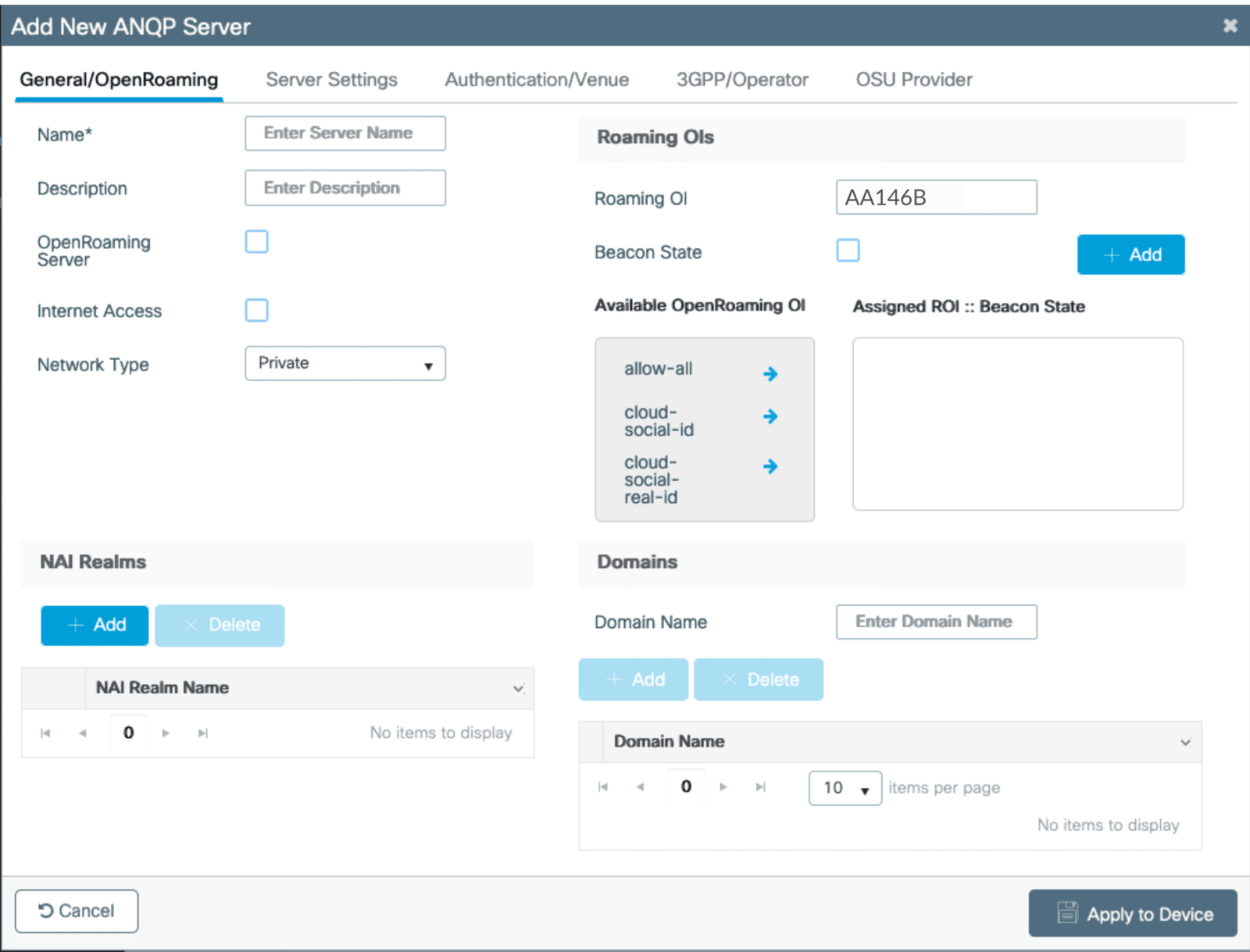 Появится диалоговое окно Add New ANQP Server. Вкладка General/OpenRoaming выбрана.