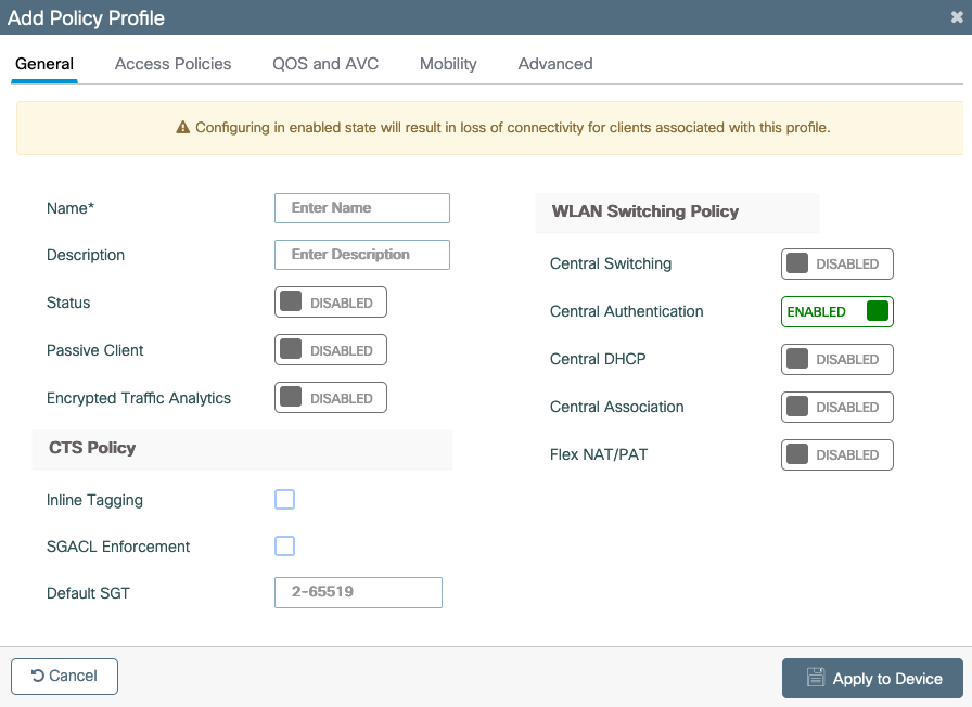 8. Оставаясь в диалоговом окне Add Policy Profile, выберите опцию Advanced вверху.