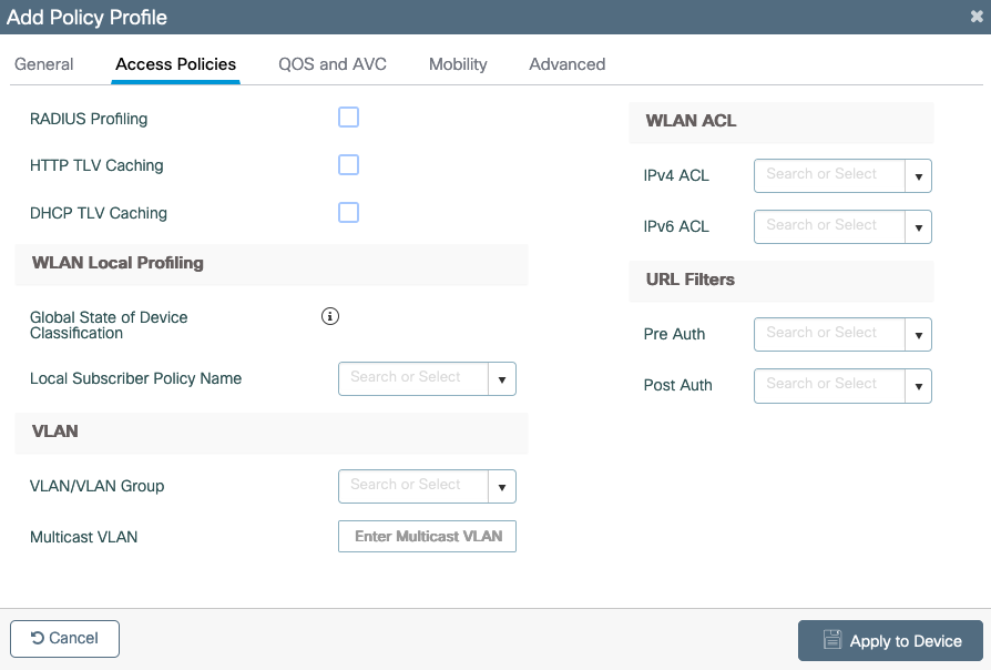 6. Оставаясь в диалоговом окне Add Policy Profile, выберите опцию Access Policies вверху.