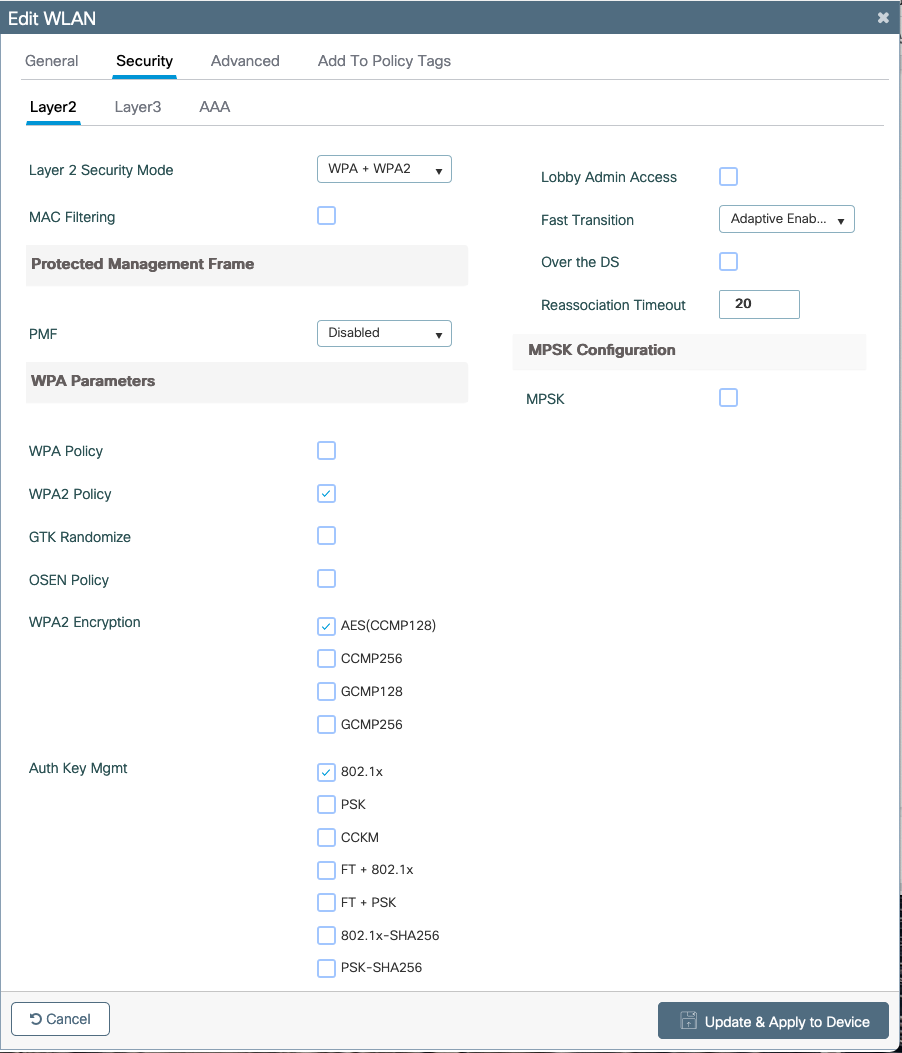 4. Для Layer 2 Security Mode выберите WPA + WPA2 (default).